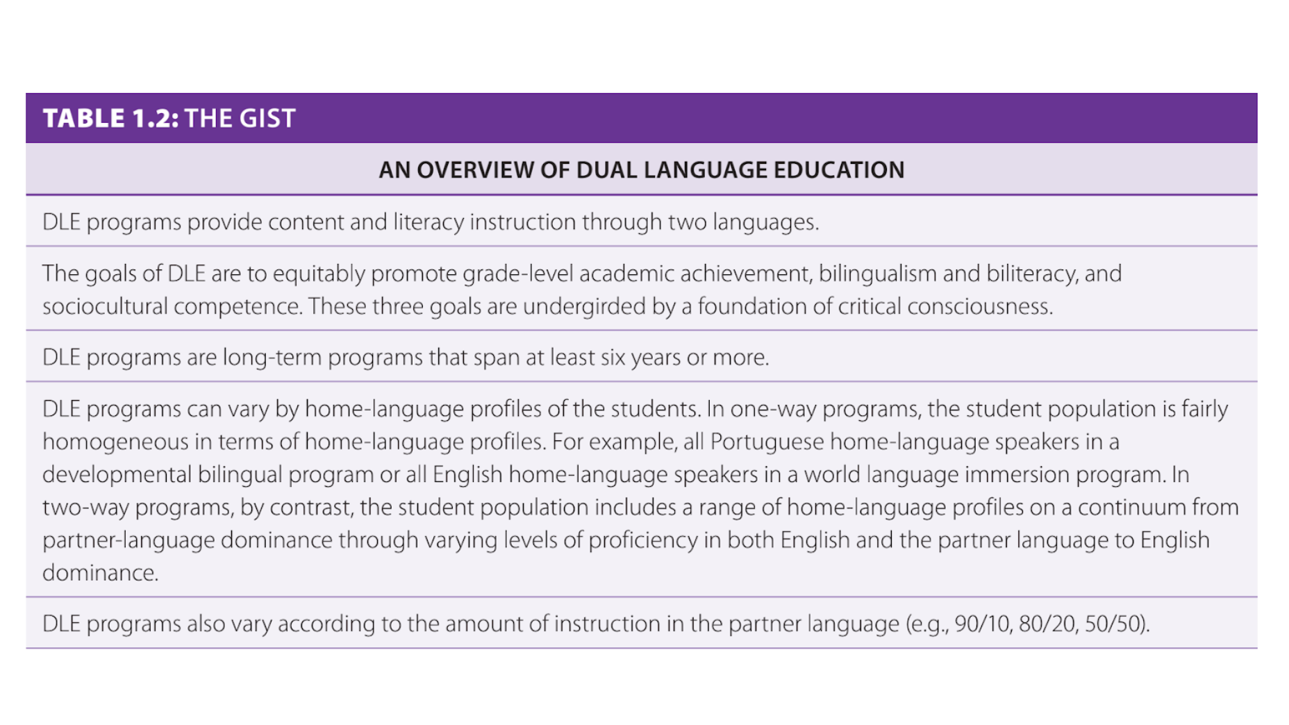 Jan 21, 2026For those who are new to dual language education (DLE), here are a few key concepts that have implications for the Tandem Teaching relationship (refer to The Gist in Table 1.2 below for just the highlights). First, all DLE programs deliver content and literacy instruction through two languages, aiming to foster grade-level academic achievement, bilingualism and biliteracy, and sociocultural competence(Howard et al., 2018). As we mentioned in the previous section, critical consciousness has been proposed as a necessary foundation for those three goals to be attained equitably (Freire, 2020; Heiman et al., 2024; Palmer et al., 2019). This framing aligns with the guiding sentence of the Dual Language Logic Model, which posits that DLE programs achieve “mission fulfillment through a continuous focus on academic achievement, bilingualism and biliteracy, and socio-cultural competence; supported by the school, home, and community; through a stance that prioritizes equity and social justice, fosters critical consciousness, and is anti-racist and culturally and linguistically sustaining” (Howard et al., 2021 in McCormick et al., 2021, p. 28).
